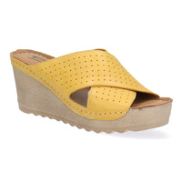 Skórzane klapki damskie na koturnie oddychające Pollonus srebrny brokat/zloty 5-1264-014
