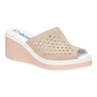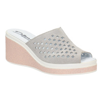 Skórzane klapki damskie na koturnie ażurowe Pollonus szary brokat/zloty5-1264-013